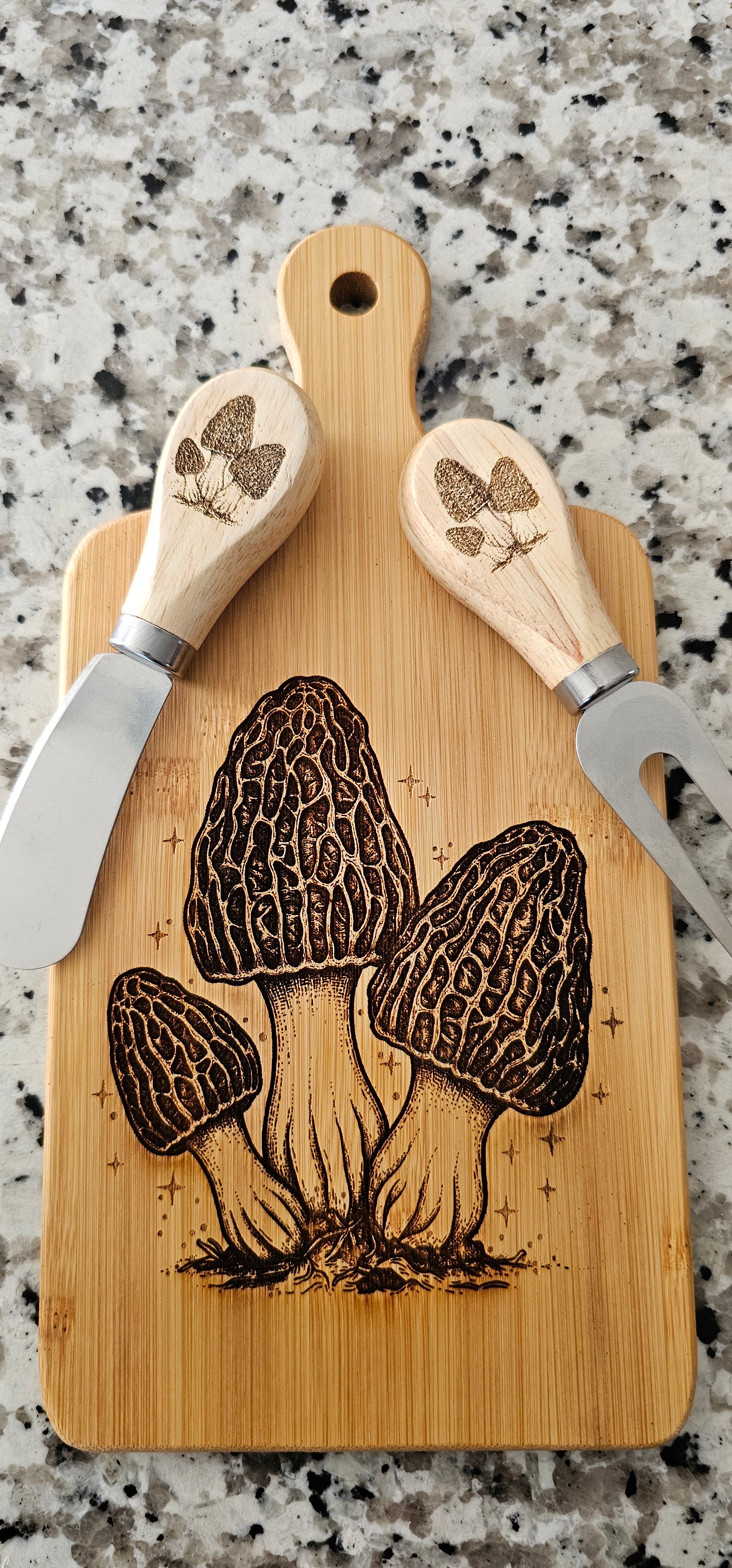 Exquisitely crafted Morel mushrooms on a cutting board with matching cutlery! Truly a great gift for any Morel hunter!